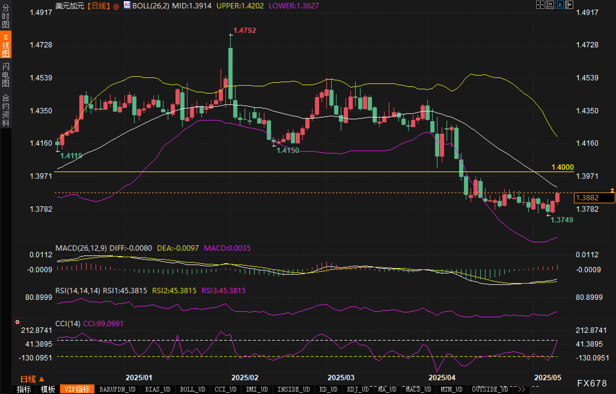 布林带指标显示,汇价已触及下轨并开始回弹,这通常是短期触底信号。不过值得注意的是,上轨持续下行,表明中长期下行趋势仍未改变。此外,图表中明显可见的1.4000心理关口将是多头面临的重要阻力位。
