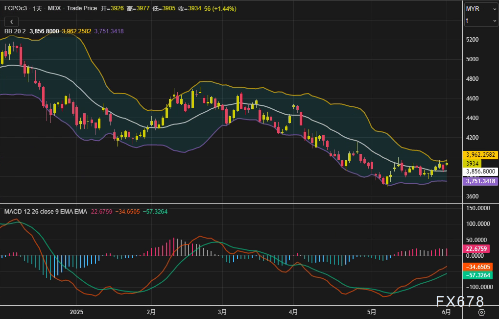 马来西亚衍生品交易所(BMD)棕榈油主力合约FCPOc3周二(6月3日)收于3934林吉特/吨,单日涨幅1.44%,创下近一周新高。技术指标显示,价格突破布林带中轨(3856林吉特),MACD柱状图收窄,短期动能有所修复。本轮反弹的直接诱因来自两方面:一是大连商品交易所豆油(DBYcv1)和棕榈油(DCPcv1)分别上涨0.39%和1.24%,二是印度政府上周五突然宣布将毛食用油基础进口税从20%下调至10%,这一政策调整迅速点燃市场做多情绪。