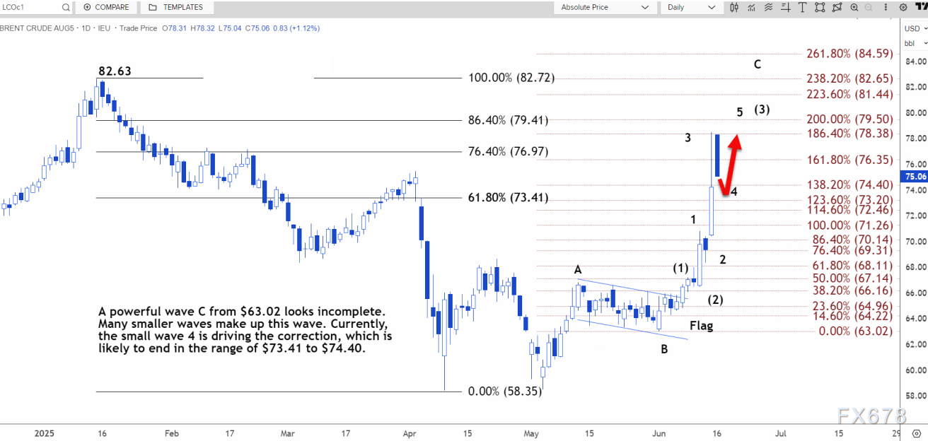阻力位在75.87美元,突破该位则可能上涨至76.79美元至78.29美元区间。日线图显示,自63.02美元开启的强劲C浪似乎尚未完成。 此浪由许多较小的波浪组成。目前,小浪4正在推动回调,回调可能在73.41美元至74.40美元的区间内结束。 预计此波将被上行第 5 波逆转。 北京时间09:53,布伦特原油现报75.02美元/桶。