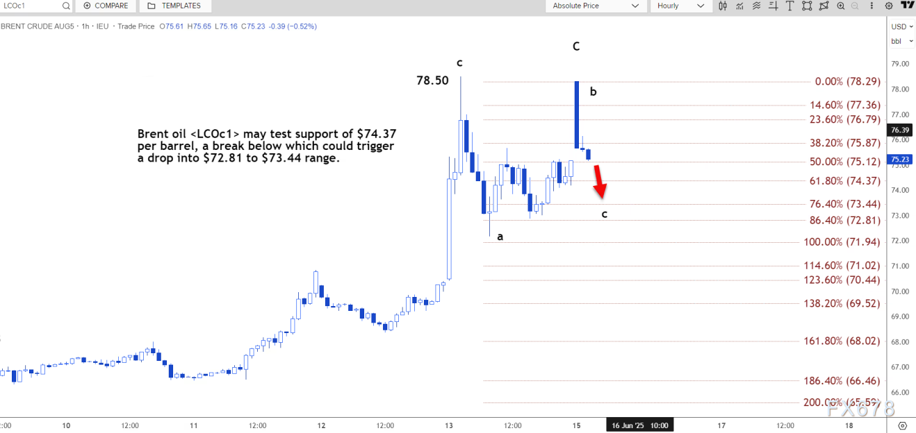 路透技术分析师指出,布伦特原油可能测试每桶 74.37 美元的支撑位,跌破该水平可能引发油价跌至 72.81 美元至 73.44 美元的区间。