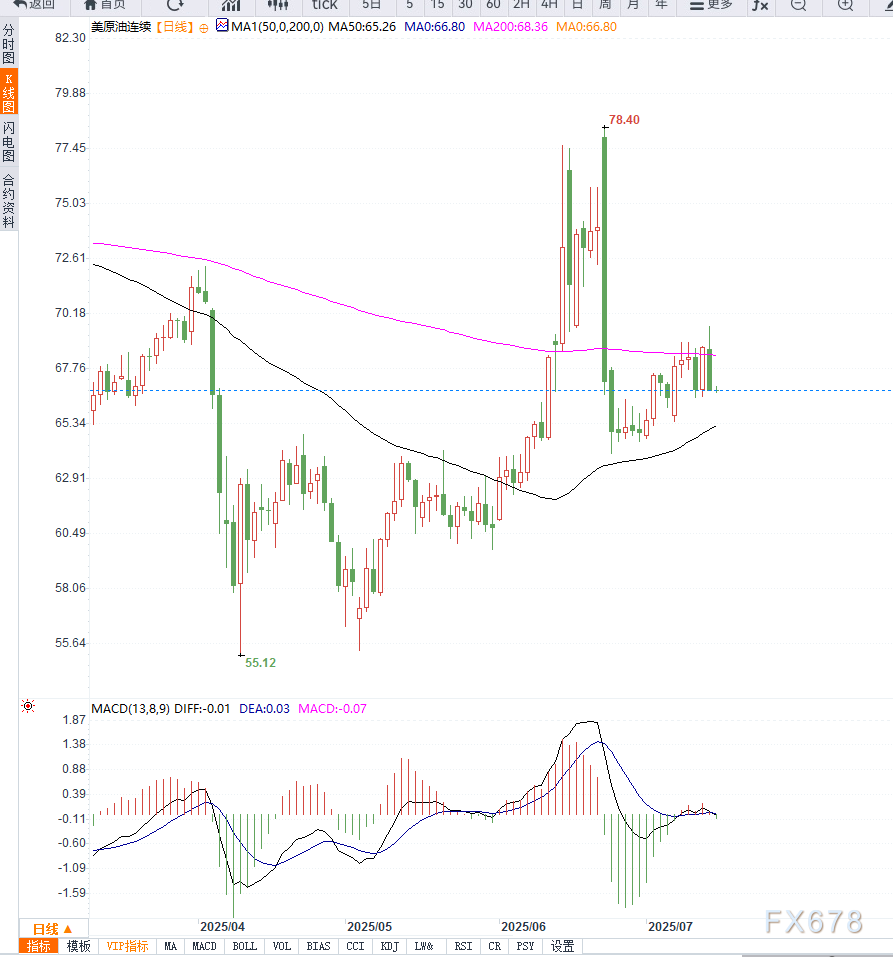 目前油价在多重不确定性中震荡调整。特朗普设下的50天通牒短期内缓解了制裁担忧,但加征关税的实质风险仍可能波及全球经济。