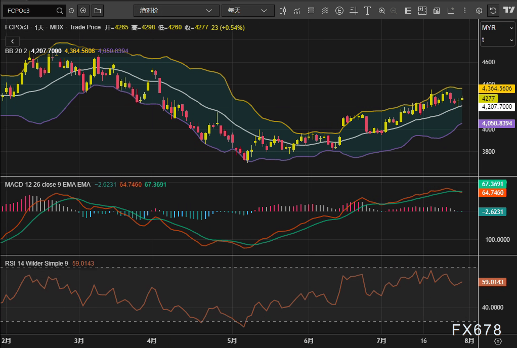 嘉盛外汇官网——周三(7月30日),马来西亚衍生品交易所(BMD)棕榈油主力合约FCPOc3延续反弹,10月合约收报4277林吉特/吨,日内涨幅0.54%,连续第二日上行。技术指标显示,价格站稳布林通道中轨(4207林吉特)上方,MACD柱状图收窄至-2.62,RSI(14)维持在59.01的中性偏强区间,短期市场呈现多空拉锯态势。