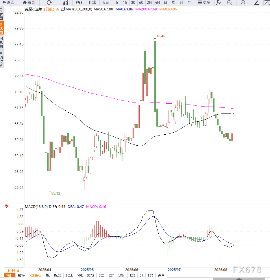 从美原油日线图来看,价格已突破短期整理区间上沿并站稳在20日均线上方,短线多头动能增强。MACD指标快线向上穿越慢线形成金叉,显示上涨趋势延续的可能性较大;