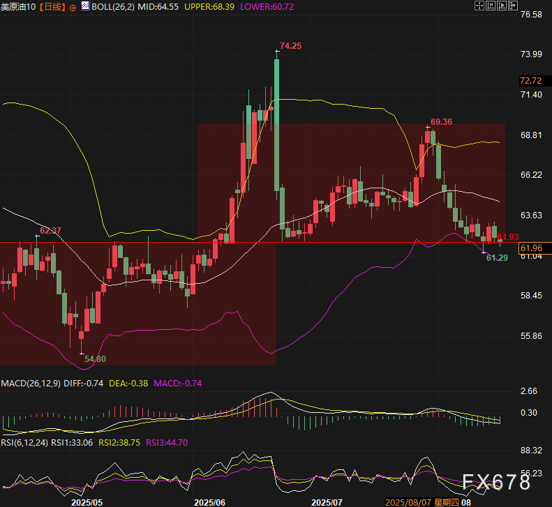周一美原油10月期货合约受美俄会谈后战争风险减退影响承压下跌,白宫特使称俄罗斯同意为乌克兰提供类似北约第五条的安全保障,但国务卿卢比奥表示距离达成和平协议仍有很长的路要走,市场关注后续俄乌谈判及特朗普与泽连斯基等会面情况,技术面显示油价处于箱体震荡,交易员押注会谈正面发展打压油价,需警惕预期反转风险。