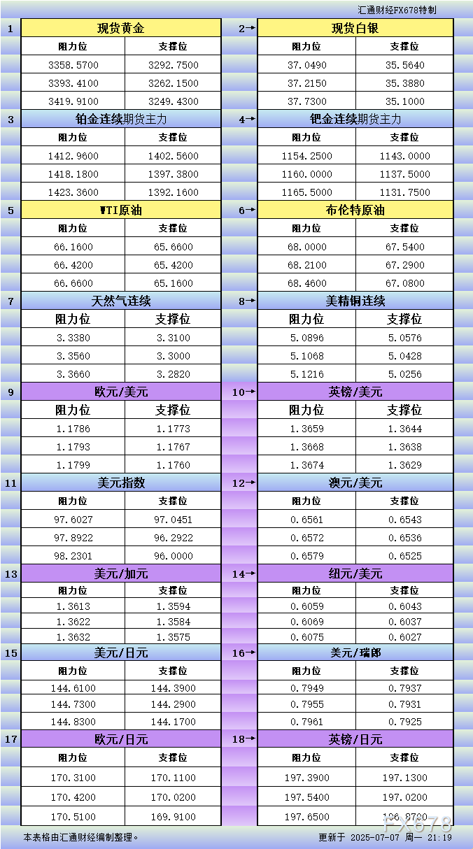 嘉盛平台官网:7月7日亚市更新支撑阻力:18品种支撑阻力(金银铂钯原油天然气铜及