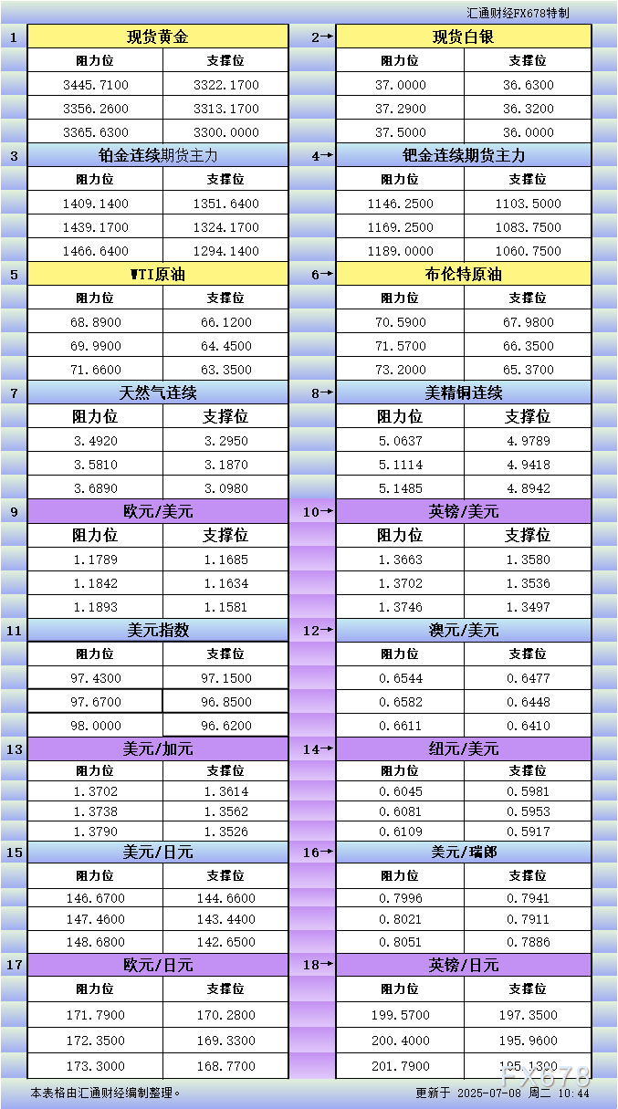 嘉盛app下载:7月8日亚市更新支撑阻力:18品种支撑阻力(金银铂钯原油天然气铜