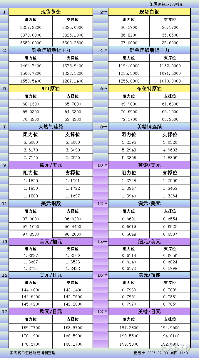 嘉盛平台官网:7月3日亚市更新支撑阻力:18品种支撑阻力(金银铂钯原油天然气铜及