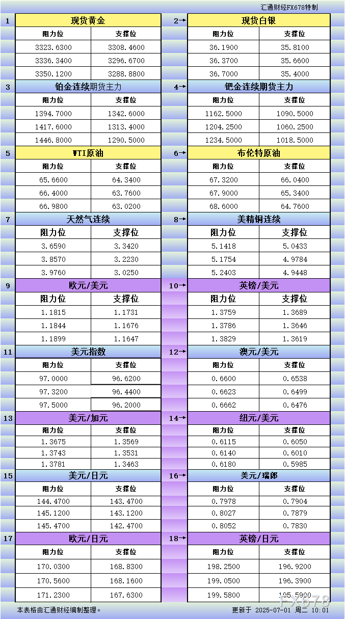 嘉盛app下载:7月1日亚市更新支撑阻力:18品种支撑阻力(金银铂钯原油天然气铜