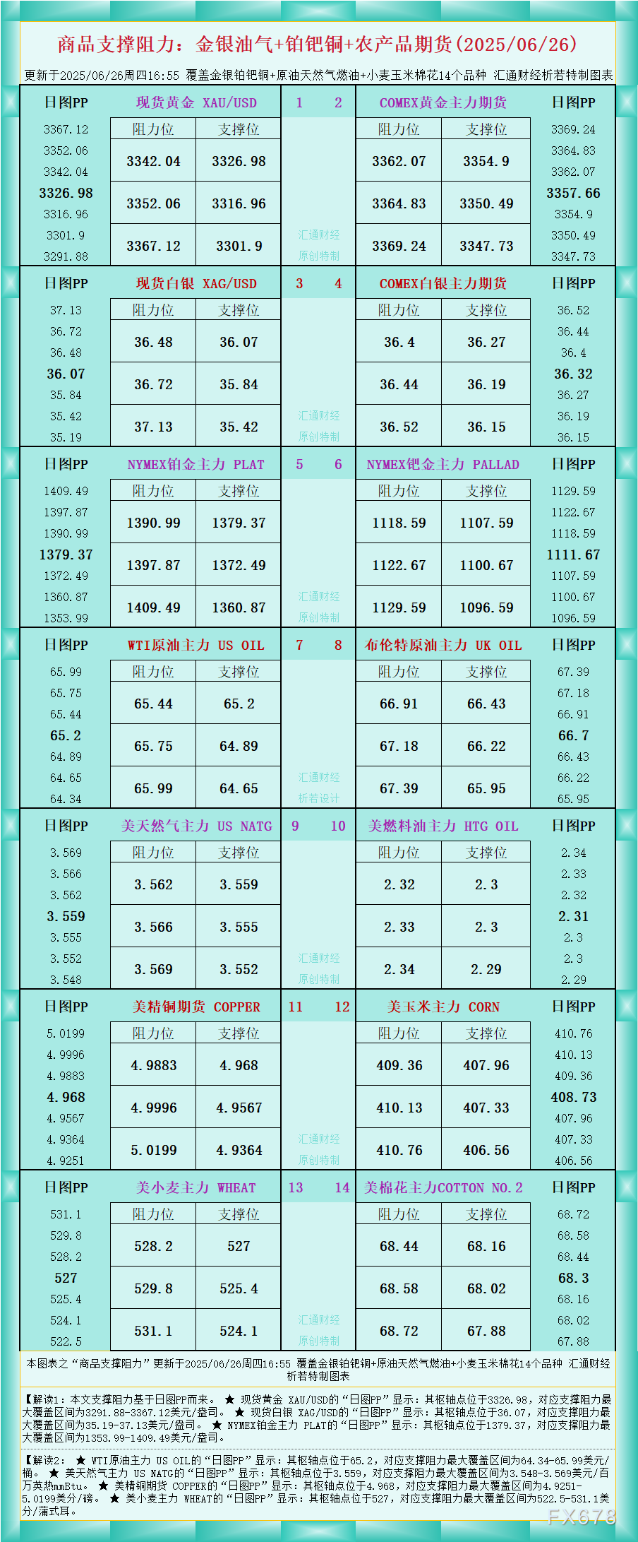嘉盛官网:一张图看商品支撑阻力:金银油气+铂钯铜农产品期货(2025年6月26日
